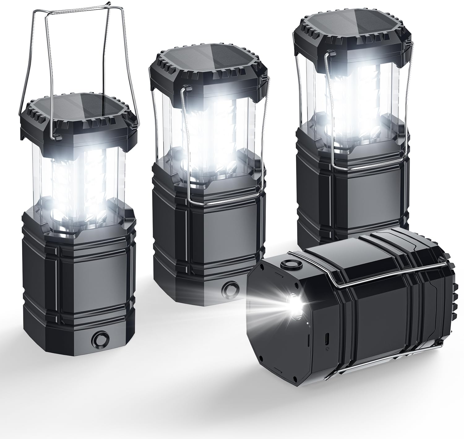 - Be ready for anything—camping trips, emergency outages, or off-grid living—with this set of four high-efficiency solar camping lanterns. Designed to combine versatility, durability, and powerful light output, these solar powered lanterns are essential gear for your home, car, or campsite.Each camping lantern rechargeable is built with a verified 1600mAh rechargeable battery, delivering long-lasting light exactly when you need it. Tested for up to 35 hours of runtime, it offers dependable brightness for extended blackouts, overnight hikes, or long campfire sessions. You can recharge quickly via USB-C or let the extra-large 60×60mm solar panel—twice the size of most standard panels—do the work under the sun.With its 2-in-1 design, each unit serves as both a 350 lumens solar lantern and a 200 lumens directional flashlight, adapting to your lighting needs in tents, on trails, or during late-night repairs. Whether you're navigating a storm or simply relaxing outdoors, the right light is always at hand.Designed for rugged outdoor conditions, this lantern is ultra-durable yet remarkably compact, collapsing down easily to fit into your backpack or emergency kit. Made from tough, weather-resistant materials, it's ready to withstand harsh environments and keep you safe and illuminated in wet conditions.With the value-driven 4-pack, you’ll have enough lanterns to cover multiple rooms, tents, or group activities, ensuring everyone in your family or group stays secure and visible. Don’t be left in the dark—make the CL1000 SE Solar Camping Lantern your essential outdoor and emergency companion today! Tips:Solar charging efficiency depends on sunlight intensity and angle. Full solar charging isn't guaranteed. Suggest using type-c charging as the primary method, reserving solar charging as a secondary emergency option.