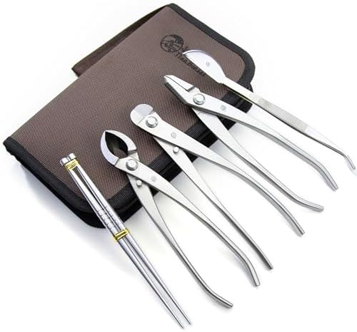 TianBonsai Bonsai Tools 5-Piece Alloy Steel Bonsai Tool Kit in Cluding 205mm Wire Cutter / 205mm Round Edge Cutter / 205mm Jin Plier / 200mm Straight Root Hook/Tweezers(NBK5-02)