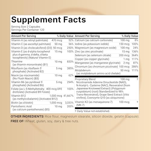 - Includes essential vitamins A, C, D3, E, and K2 (MK-7), along with a B complex featuring B2 Riboflavin 5’-Phosphate, B6 P5P, Biotin, Methylfolate, and B12 Methylcobalamin, plus key minerals like calcium, magnesium, and zinc, with added support from NAD, NAC, Resveratrol, Grape Seed Extract, and CoQ10.