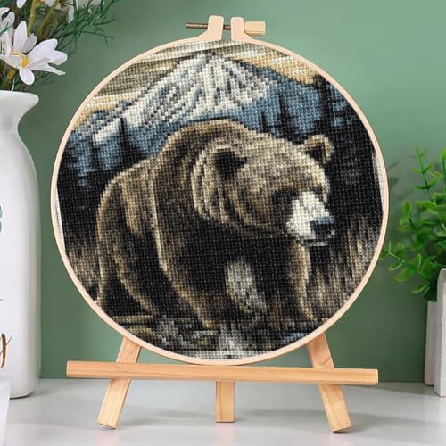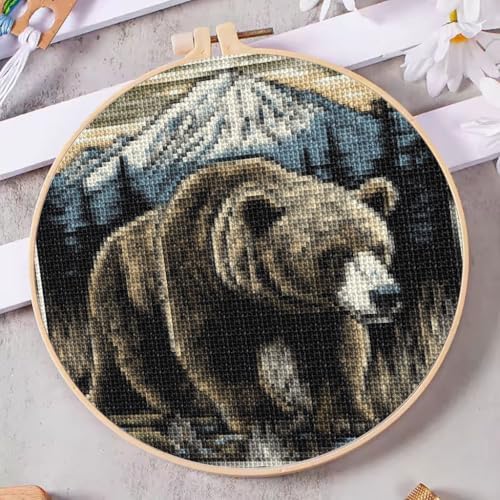DIY Counted Cross Stitch Kits Grey Bear with Mountains Easy for Beginners with Hoop 11CT Needlepoint Embroidery Cross Stitch Set Craft Wall Art Decor 22x22cm(4)