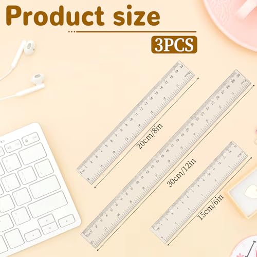- 【Packaging List】The package contains 3 packs of transparent rulers, of different lengths and three sizes, 6 inch/15 cm, 8 inch/20 cm, and 12 inch/30 cm, with both imperial and metric scales engraved on the surface.