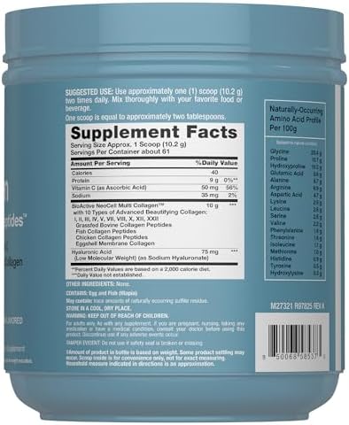 Our formula includes BioActive NeoCell Multi Collagen which features 10 types of advanced beautifying collagen, including types 1, 2, 3, 4, 5, 7, 8, 10, 12, and 22. Our collagen is derived from grassfed bovine collagen peptides, fish collagen peptides, chicken collagen peptides, and eggshell membrane collagen. Since NeoCell collagen is broken down into smaller molecules, called peptides, it is more easily absorbed by the body to support healthy skin and joints.** Our formula features 75 mg of Hyaluronic Acid per serving, a polysaccharide with a chemical makeup that attracts and holds water molecules. It acts as a humectant, which means it helps bind water to your body’s cells. Hyaluronic Acid is a wonderful way to support and promote skin elasticity and hydration.** Vitamin C is an antioxidant that plays a vital role in overall wellness and is known for its role in collagen production.** When combined with Collagen and Hyaluronic Acid, Vitamin C can help to maintain healthy and radiant skin.** Our unflavored powder mixes seamlessly into your favorite food or beverage so you can enjoy it without worrying about overpowering flavors or unfavorable textures. Our formula is keto friendly and gluten free. For nearly 30 years, NeoCell has been a trusted leader in unlocking the transformative benefits of collagen and essential nutrients. Trusted by millions, our science-backed products are designed to illuminate your inner beauty in a way that stands the test of time.* Explore our thoughtfully crafted products and uncover the secret to enhancing your natural beauty and wellness, year after year, from the inside out.* **Compared to non-enzymatically treated gelatin *These statements have not been evaluated by the Food and Drug Administration. This product is not intended to diagnose, treat, cure, or prevent any disease.