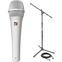 - Complete Microphone Bundle for Professional Sound This complete microphone bundle provides everything you need to perform or record with confidence. It includes the sE Electronics V7 Supercardioid Dynamic Handheld Vocal Microphone in sleek white, the versatile On-Stage MS7701B Euro Boom Microphone Stand, and a 20-foot professional XLR cable. Whether you’re a vocalist, musician, or podcaster, this all-in-one package ensures you get clear, crisp sound and a reliable, durable setup that’s perfect for both live performances and studio use. With top-quality components and thoughtful design, this bundle offers superior sound and ease of use for any performer or content creator. Crystal-Clear Sound with the sE Electronics V7 Microphone The sE Electronics V7 microphone is engineered for superior sound quality, making it the ideal choice for capturing vocals and instruments. Featuring a custom aluminum voice coil, it delivers crisp, open sound that faithfully reproduces your voice. The microphone’s supercardioid design provides excellent isolation from background noise, ensuring that your voice is captured clearly without interference, even at high preamp gain. The V7’s superb feedback rejection and near-perfect isolation allow for flawless performance in both studio and live settings, making it a must-have for professional musicians and performers. Durable and Road-Ready Design Built with durability in mind, the sE Electronics V7 is designed to handle the demands of both the stage and studio. Its zinc alloy construction offers a lightweight yet robust design that can withstand the rigors of live performances, while the spring steel grille ensures resistance to dents and corrosion. Whether you’re using it on tour or in a recording environment, the V7 will provide consistent performance over time. The beveled edges of the grille help prevent the microphone from rolling off surfaces when not in use, adding extra convenience and practicality for musicians on the move. Advanced Sound Control with Shockmount and Windscreen The V7 microphone is equipped with an integrated shockmount that decouples the capsule from the rest of the microphone, drastically reducing handling noise and stage rumble. This feature ensures that the microphone picks up only the desired sound, without unwanted vibrations or distractions. Additionally, the internal windscreen works in tandem with the spring steel grille to eliminate wind noise and plosives, preventing interruptions in your performance. The inclusion of both red and black windscreen options gives you the flexibility to choose the look that suits your style while maintaining exceptional sound clarity. Stable and Adjustable Microphone Stand for All Environments Included in the bundle is the On-Stage MS7701B Euro Boom Microphone Stand, a solid, reliable stand perfect for both stage and studio use. The stand features a 30-inch boom arm, making it easy to position your microphone exactly where you need it for optimal sound capture. Its height is adjustable from 36 to 64 inches, accommodating performers of all heights. The stand’s wide 23-inch tripod base ensures rock-solid stability, even with heavier microphones, so you can focus on your performance without worrying about your equipment. Additionally, the stand collapses flat for easy storage and portability, making it an ideal choice for musicians and performers on the go. High-Quality XLR Cable for Seamless Audio Transmission The bundle also includes a 20-foot professional XLR cable, providing a reliable and noise-free connection between your microphone and audio equipment. The XLR cable is designed for minimal interference, ensuring clean, clear audio transmission every time you use it. With a length of 20 feet, this cable offers plenty of flexibility for stage performances, allowing you to move around freely without being limited by the cable length. The high-quality build of the cable ensures longevity and durability, providing you with years of reliable performance.