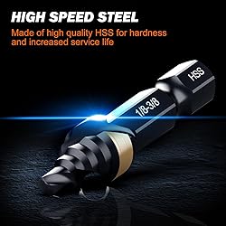 ENHANCED DURABILITY: Our industrial-grade step drill set is meticulously crafted from high hardnessy HSS and undergoes multiple manufacturing processes. Each drill bit is carefully inspected at the factory to ensure superior quality and longevity IMPROVED STABILITY: Unlike ordinary step drills that often suffer from deflection during cutting, our spiral step drill bit provides exceptional stability. This feature enhances accuracy and cutting speed, making it perfect for stainless steel drilling. Additionally, this single-size step drill is small and compact enough to carry as an EDC VERSATILE DRILLING CAPABILITY: With its powerful drilling capability, our step drill is suitable for piercing holes in various materials, including thin metal, copper, aluminum, iron, wood, and plastic. It's an essential addition to any DIY enthusiast's toolbox and can be utilized for a wide range of household projects USER-FRIENDLY DESIGN: Our step drill bits feature laser-engraved step sizes, ensuring clear visibility and eliminating concerns about wear and tear during use. This design element enhances convenience and accuracy, making the drilling process easier and more efficient DEDICATED CUSTOMER SERVICE: While our products undergo stringent quality inspections, unforeseen issues caused by accidental factors may occur. In such cases, we are committed to providing professional customer service. If you encounter any quality problems, please contact us via Amazon, and we will promptly replace the defective item with a new one