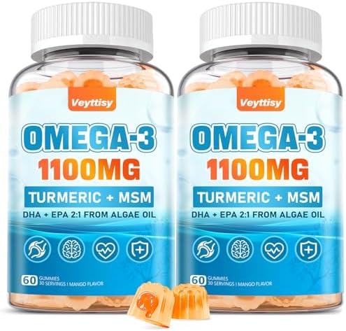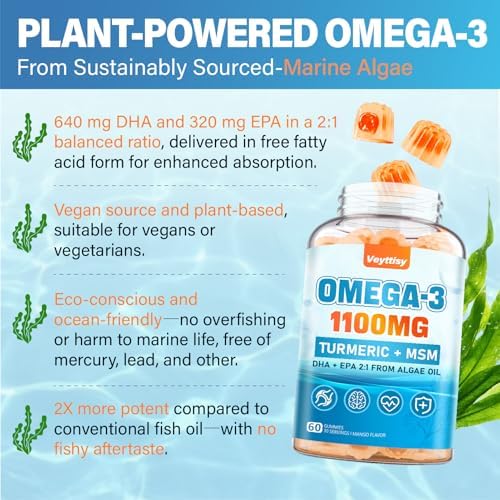 - PLANT-BASED OMEGA-3 FORMULA: Our vegan omega 3 gummies contain 1100 mg Omega -3, a 2:1 ratio of DHA and EPA and other Omega 3 Fatty Acids, providing a powerful source of essential fatty acids. Enhanced with Vitamins C, E, D3, Zinc, Turmeric, MSM, and Astaxanthin, this synergistic blend supports flexible movement, sharp thinking, robust immunity and radiant skin. With added black pepper for enhanced nutrient absorption. Get your daily Omega-3 in just 2 gummies!