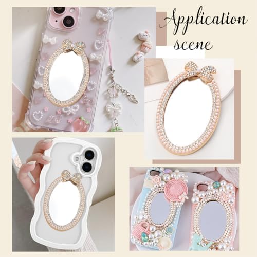 - High Quality Material: Gold bow cell phone makeup mirror is made of glass and alloy. The rhinestones and imitation pearls inlaid around the mirror shimmer charmingly in the light, exuding a delicate and elegant atmosphere, gentle and romantic