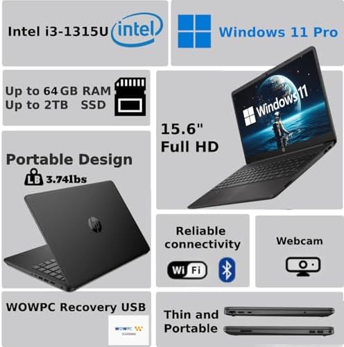 Accessory: WOWPC Recovery USB Operating System: Windows 11 Pro 64 Bit Processor: intel Core i3-1315U (Processor) Number of Physical Cores: 6 Core, 8 Thread (Processor) Base Speed 3.3 GHz (Processor) Turbo Speed: Up to 4.5 GHz (Processor) Cache: 10MB RAM: Up to 64GB Storage: Up to 2TB (PCIe-NVMe) Graphics: Integrated: Intel Graphics Display: 15.6" diagonal, FHD (1920 x 1080), IPS, narrow bezel, anti-glare, 250 nits Wireless: Wi-Fi, Bluetooth Optical Drive: DVD±RW Ports:1x SuperSpeed USB-C 10Gbps, 2x SuperSpeed USB-A 10Gbps, 1x Headphone/microphone combo, 1x HDMI 1.4 Output, 1x RJ-45, 1x Audio-out Audio: Dual stereo speakers, dual array microphones Keyboard: Full-size keyboard with numeric keypad, US English Dimensions L x W x H (inches): 14.09 x 9.53 x 0.78 Inches Built-in HD Webcam: HD 720p Weight: 4 LB
