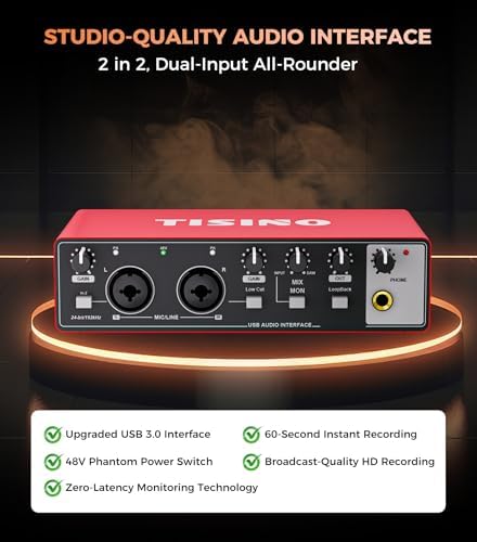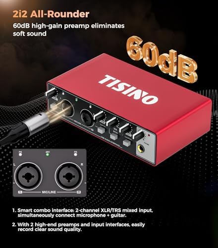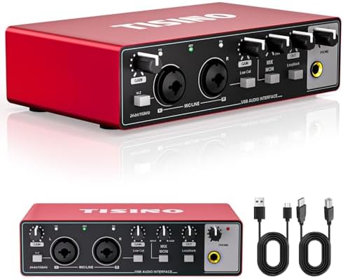 TISINO Audio Interface 2i2-24Bit/192kHz, USB Audio Interface for Recording, Songwriting, Streaming and Podcasting, Plug & Play Studio Interface with 48V Phantom Power, PC/Mac/iOS Compatible,RED