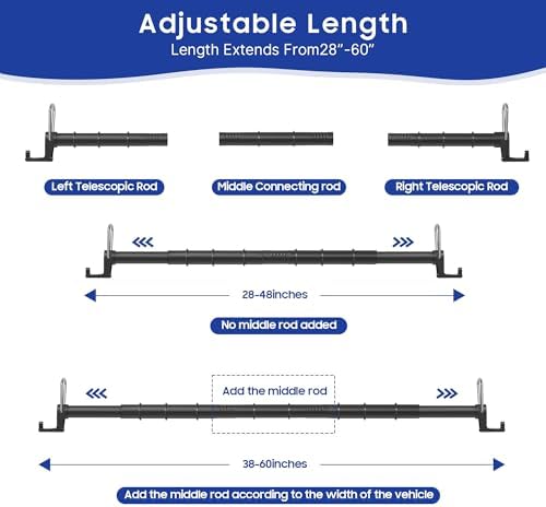 - 【Adjustable Length】: Featuring a telescopic design, this versatile travel clothes rack effortlessly extends from 28 inches to 60 inches. It fits perfectly in most vehicles, including sedans, SUVs, minivans, and RVs, making it the best choice for road trippers needing a dependable clothes rack for car.