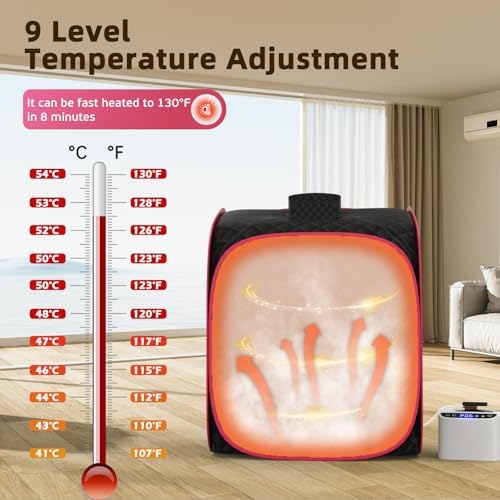 - 【9 Levels Heating & 15s Fast Heating】 - The full size personal sauna box has 9 levels heating and can reach maximum temperature of 140℉. The 2.6L large capacity sauna steamer with 1000W heating element, can reach maximum temperature of 140°F/60°C in 15 minutes. The sauna steamer can be set to run for 1-90 minutes, allowing you to fully enjoy the steam sauna spa at home. The full size personal sauna box is equipped with remote control that allows you to control the heating level and timing.