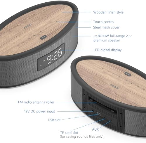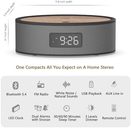 Bluetooth Clock Radio Speaker Aesthetic Design with Phenomenal Sound Quality, Built-in Sound Machine, FM Radio, USB, AUX, Dual Music/Radio Alarms