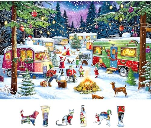 • 【Unique Winter Campsite Theme with Fun Shaped Pieces】Vibrant scene featuring decorated caravans, snowmen in Santa hats, elves by a campfire, and twinkling lights—plus unique shaped pieces (like cats, mugs) for extra fun