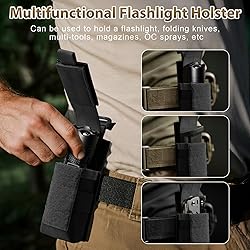 - Our tactical flashlight holster is made from tough 1000D nylon and reinforced stitching for long-lasting durability, tear-resistant, wear-resistant. The back features a lightweight and durable malice clip, a sturdy KAM two-way Z-shaped buckle on the top, and a steel drain hole rivet at the bottom. The flashlight holster not only holds a flashlight but also folding knives, multi-tools, magazines, OC sprays, etc. A great supplementary equipment for police, law enforcement, security, firefighters, mechanics, guards, outdoor enthusiasts, etc. Ideal for walking, hiking, camping, fishing, bike riding, dog walking and other daily or duty/patrol shift scenarios.