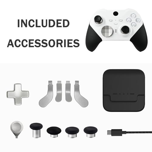 - With Package Accessories :1 X Controller,6 joystick caps, 2 D-pad keys (D-pad/disc key), 4 back button paddles,1 adjustment tool,1charging dock,1 USB-C Charging Cable