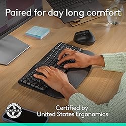 Feel the Wave. Feel the Lift: Wave Keys ergonomic wireless keyboard and Lift vertical ergonomic mouse are matched to turn your desk life into a feel-good story Type comfortably all day: This compact keyboard’s wavy design supports natural hand, wrist, and forearm alignment, while the plunger key switches deliver a tactile, discreet, and satisfying typing experience More palm support, less strain: This ergonomic Bluetooth keyboard features a cushioned memory foam palm rest, providing all-day comfort and enhanced wrist support (1) Raise your hand into comfort: Small to medium hands feel great on Lift wireless vertical mouse, with a softly textured grip and snug thumb rest 57° of sooooothe: Lift’s vertical shape takes the pressure off your wrist, and promotes a more natural posture in the forearm for day-long comfort and productivity Alt for transcreation: ‘optimal 57° vertical angle’ Relax into focus: Customize your workflow with the Logi Options+ app and enjoy whisper-quiet clicks plus a SmartWheel that seamlessly adjusts scrolling speed to match the pace of your flicks Ergo-certified: Wave keys and Lift have been designed, tested and approved according to criteria set out by leading ergonomists Plastic parts in Wave Keys and Lift (graphite) include certified post-consumer recycled plastic (Keyboard: 61%(5), Mouse: 70%(5).
