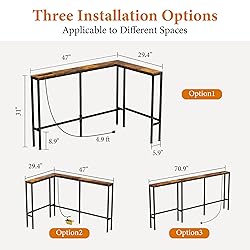 - Product Name: GRLEAF L-Shaped Narrow Console Table with Outlets Upgrade your living space with our innovative console table, expertly designed to solve the problem of awkward empty spaces behind your sofa. More than just a table, it's a multifunctional hub that combines clever storage, integrated charging, and modern aesthetics to bring ultimate organization and convenience to your home. 🏠 Space-Saving L-Shaped & Straight-Line Designs 🔌 Integrated Charging Hub for Modern Needs 💡 Optimizes Unused Space Behind Your Couch ⚙️ Durable Construction & Versatile Use 🛠️ Straightforward Assembly & Reliable Support Product Dimensions:29.4"D x 47.2"W x 30.98"H(L Shape) Product Width:5.9 inches Color:Rustic Brown Table design:L Shaped Behind Couch Table Maximum Weight:220 Pounds Included Components:Assembly Guide