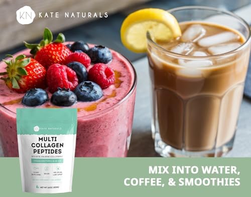 Kate Naturals Multi Collagen Peptides with Biotin, Hyaluronic Acid, & Vitamin C (16oz, Hydrolyzed, Unflavored) Types I, II, III, V, X Collagen for Hair, Skin, Nails, & Joints