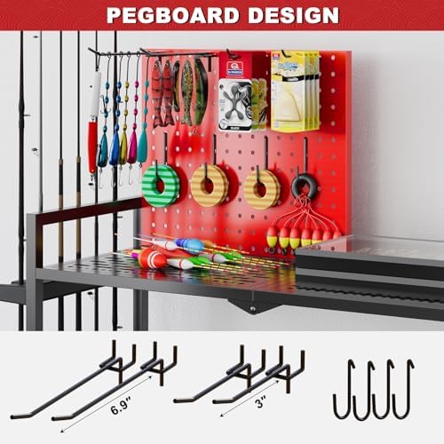 - Custom Pegboard System for Tools & Accessories: A versatile pegboard system on the top shelf allows for personalized organization of baits, lures, fishing gloves, sunscreen tools, and other small items. The ultimate fishing gear organizer to keep everything within reach and neatly arranged