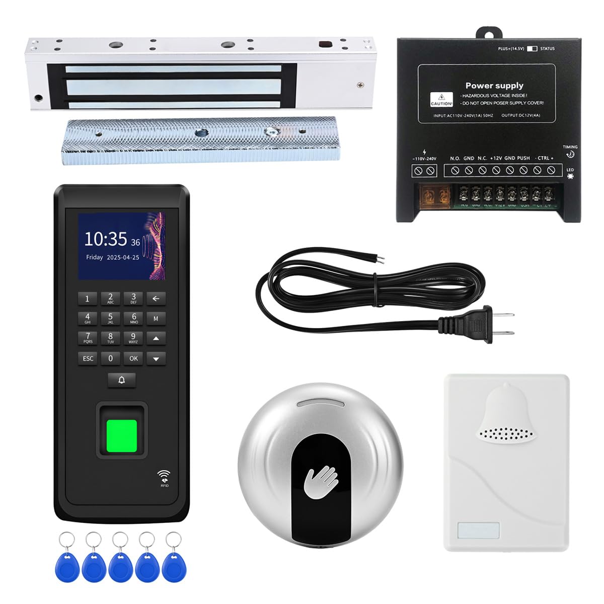 - All-in-One Access Kit - Complete system includes access control keypad, power supply control, 1200lb electromagnetic lock, no-touch infrared exit button, wired doorbell, and power cord for easy setup.
