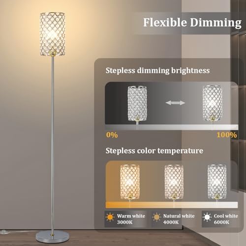 Crystal Floor Lamp with Remote Control, Smart Modern Silver Floor Lamps for Bedroom, Living Room, Crystal Standing Lamp Silver Home Décor, LED Bulb Included