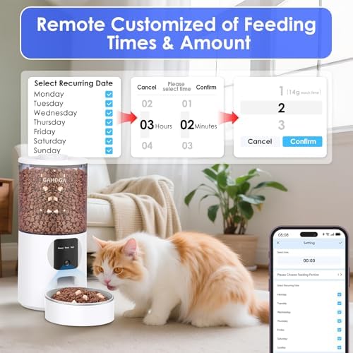 • 【Smart App and Dual-Band WiFi Contro】:Cat food dispenser automatic easily connects to 5GHz and 2.4GHz WiFi. Whether you're sleeping, traveling, working, or at a party, you can adjust feeding times, see your pet through the monitor, and manage alerts anytime, anywhere.