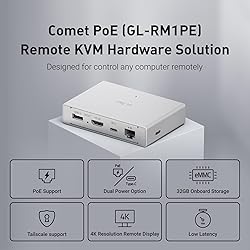 【Power over Ethernet (PoE)】 Comet PoE (GL-RM1PE) enables easy device powering with PoE support. Users can simply connect it to a PoE switch to eliminate extra power adapters and reduce cable clutter. 【Built-in Tailscale】 Enables secure, efficient data transfer between devices using WireGuard's encrypted transmission and direct connection features. Ideal for home labs, offices, and multiple networking scenarios. 【Dual Power Option(POE & Type-C)】 It supports 5V power adapters, both PoE and the adapter can be used simultaneously for enhanced power stability. 【Built-in 32GB eMMC Storage】The Comet PoE (GL-RM1PE) comes with built-in 32GB eMMC storage, pre-loaded with multiple system images for quick and reliable device restoration or updates. This simplifies system management and future-proofs your network. 【4K@30Hz HD Video & Ultra-Low Latency】 Experience ultra-clear, low-latency 4K video streaming with efficient H.264 hardware encoding. Combined with built-in two-way audio, it enables seamless audio conferencing, real-time troubleshooting, and remote monitoring, making it ideal for professional communications and management. 【Flexible Local & Remote Access】 Access your GL-RM1PE locally/remotely via broswer,no installation needed, windows/MacOS/Linux support . Also support remotely via the GLKVM app(windows/macOS)/Tailscale. 【ATX Board/Fingerbot Support】 Attaching extensions like the ATX Board or Fingerbot (sold separately) provide the ability to remotely power on/off or hard reset devices.