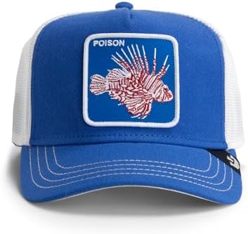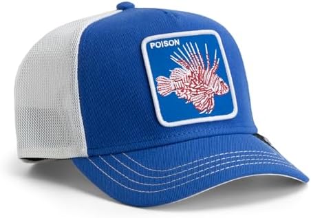 Goorin standard OG Trucker fit with cotton front and poly mesh back. Seasonal animal patch showing a Lionfish with the word "POISON" embroidered.