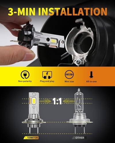 - Compact Size, Effortless Installation: Setting a new standard in bulb design, our H7 driving lights are optimized for appearance and functionality. They need external driver boxes and wires, boasting a size 20% smaller than typical lights—nearly mirroring the compactness of halogen bulbs in a 1:1 ratio. This streamlined design seamlessly resolves common installation challenges, including compatibility with dust covers