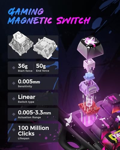 - Next-Gen Magnetic Switch Performance – Equipped with Hall Effect magnetic switches co-engineered with Gateron for 0.005mm precision and adjustable actuation (0.1mm–3.5mm). Tune each key’s trigger depth for lightning-fast combos or deliberate presses, and hot-swap switches without soldering to customize your feel on the fly.