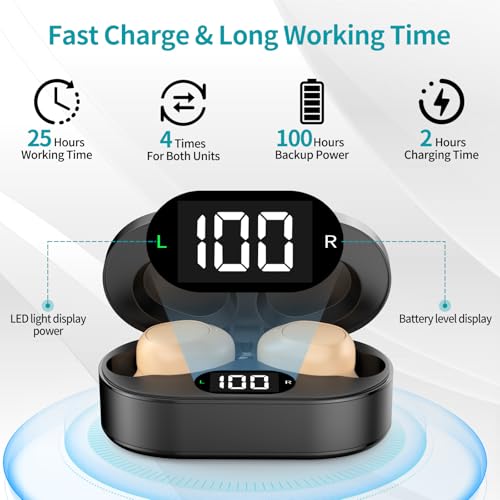 - 【Intelligent Charging Case With Power Display】The rechargeable hearing aid and charging case can be fully charged within 1.5 hours, providing up to 40 hours of continuous use of hearing aids and storing 55 hours of standby power on the charging case, you can wear it all day with confidence. screen on the charging case can clearly show the remaining power, the hearing aids can be charged anytime and anywhere.