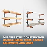 Garage Organization and Storage Made Easy: Organize your shop, basement, or outdoor workshop with this hanging shelf storage. Ideal for lumber, skis, skateboards, snowboards, and other long objects Easy Wall-Mounted Storage: Increase storage in your garage or workshop by mounting this space saving garage shelf. Perfect for organizing your workbench area. Gives you more room to operate Heavy-Duty Capacity: Each wood organizer shelf is built to hold up to 110 lbs (over 300 lbs. total). Perfect for storage and organization of heavy boards, logs, pipes, hoses, sheet metal, and other materials 3-Layer Storage: Customize the Wood Racks to fit your needs. Use the bottom tiers for wood and pipes and add boards to the upper levels for extra wall storage racks and shelving Strong & Reliable: Built from powder-coated steel tubes, this heavy duty metal wall shelf is designed for lasting strength, providing years of dependable wood rack storage performance
