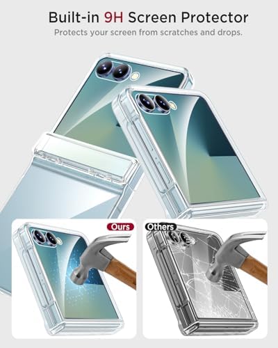 - 【Built-in 9H Tempered Glass Screen Protector】The Flip Phone Case Galaxy Z Flip 7 Transparent features a built-in 9H tempered glass screen protector, seamlessly integrated into this crystal-clear case. hether you're rushing through busy streets, tossing your phone into a bag full of keys, or simply using it daily at work, the Funda Para Flip7 Case Protective resists scratches from coins, pens, and other sharp objects while maintaining flawless clarity and without dulling the vibrant colors.