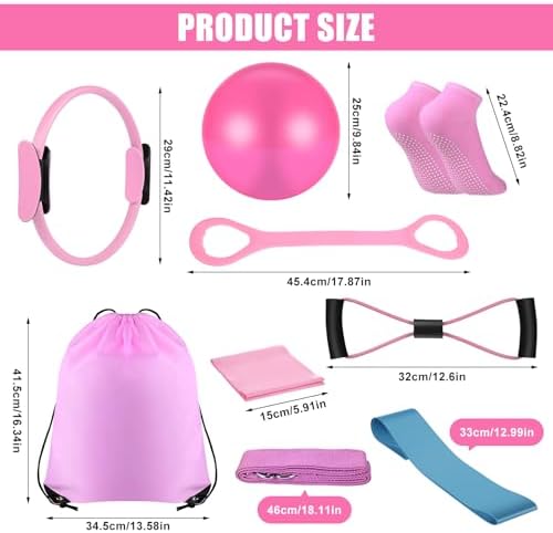 - 【SIZE INFORMATION】-Our pilates rings measure in 2 size-11.4 inch and 12.2 inch, and the yoga ball is 9.84 inches in diameter. The yoga stretching strap is 59.06 x 5.9 inches in size and the gym bag is 13.58 x 16.34 inches in size. These appropriately sized accessories ensure convenience and ease of use during workouts.