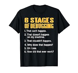 - 6 Stages of Debugging Programming Humor is perfect For Men, Women, Kids, Brother, Sister, Father, Dad, Mother, Mom, Son, Daughter, Grandpa, Grandma, Friends, Friend. Perfect for programmers and engineers. 6 Stages of Debugging Programming Humor is perfect For Christmas, Halloween, Thanksgiving, New Year, Easter, Birthday, Birthday's, Father's Day, Mother's Day, or any other occasion. Fun statement for tech lovers.