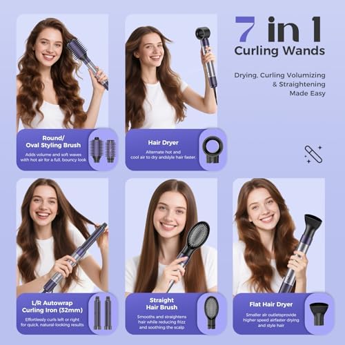 - [7-in-1 Multi-Styler Powerhouse] Includes 1.25" Auto-Wrap Curlers (Left & Right), an oval brush, round brush, straightening brush, and concentrator nozzle—so you can switch between silky straight and bouncy curls without switching tools. The 110,000 RPM high-speed motor delivers powerful airflow up to 23m/s, helping you dry and style in half the time while reducing frizz, heat damage and adding shine.