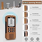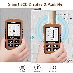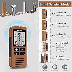 5-in-1 Multifunction Stud Detector: The upgraded 5-in-1 stud finder wall scanner meets diverse scanning needs. Choose from five stud detection depths in wall detector scanner: Stud Scan (0.5", 1", 1.5"), AC Scan (2"), and Metal Scan (2.36"). Wall stud finder effortlessly detect wood studs, metal objects, joists, pipes, and live AC wires behind walls, floors, and ceilings. Rapid testing saves time and effort and makes tasks easier to complete. Precision & Sensitivity Wall Scanner: Equipped with an advanced intelligent microprocessor chip, this stud detector offers exceptional sensitivity. The stud finder wall scanner swiftly and accurately locates the center and edges of hidden objects, saving you significant time and effort on any project. Whether you're a professional contractor, homeowner, or DIY enthusiast, this stud and electrical finder wall scanner screw scanner proves invaluable for your tasks. HD Display & Audio Alerts: This stud locator as circuit breaker finder tool features a bright backlit LCD screen. Stud sensor provides intuitive visual indication of stud centers, edges, positions, and battery status. The wood stud finder, wire, and pipe detector utilizes clear audio tones – the beeping intensifies as you approach the target. This ensures precise detection even in low-light environments. User-Friendly Design: This wood detector for wall features dedicated buttons for each function and an ergonomic non-slip grip, delivering comfortable and effortless operation. For optimal accuracy, simply calibrate using the side button when switching modes to minimize errors and ensure reliable detection of objects behind walls. Stud detector is compact, lightweight design ensures easy portability, and the vibrant color allows for quick identification in your toolbox or workspace. Versatile Applications: This stud finder wall scanner quickly locates wooden studs, metal objects, and live AC wiring concealed within walls, floors, and ceilings. Wall detector scanner helps you avoid hazards when hanging items like TV brackets, picture frames, wall cabinets, garage shelving, tiered racks, bathroom fixtures, and other decorations. This makes it an indispensable tool for renovation projects, furniture installation, and home improvement tasks.