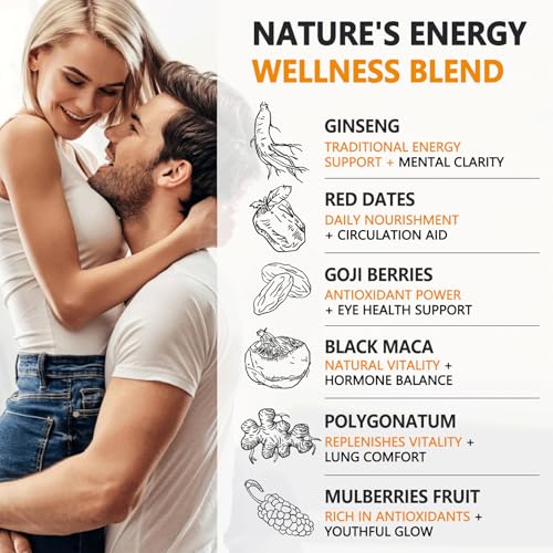 - Pure Natural Ingredients with No Additives - Contains 6 premium herbs: ginseng (energy), goji berry (antioxidants), mulberry fruit (blood health), maca root (stamina), red dates (qi boost) and polygonatum (kidney tonic). No caffeine, sugar, artificial flavors or preservatives. Naturally dried and scientifically blended for maximum efficacy and safety.