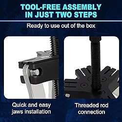 Complete 2-Piece Set: Our gear puller set comes in two convenient sizes, 3 inches and 7 inches, making it perfect for disassembling various components such as gears, pulleys, bearings, and flywheels. Whether you're a mechanic or run an auto repair shop, these tools are essential for your needs. Effortless Assembly: With our two-step quick installation, you can have your pulley puller ready to use in just one minute. Unlike traditional pullers, our design minimizes the number of screws and nuts required, reducing the risk of loose parts during frequent hook switching. Flexible Jaw Conversion: Effortlessly switch between a two-jaw and three-jaw wheel puller for versatile pulling power. Use two jaws for strong pulling force, ideal for small bearings and gears. Three jaws form a stable triangular structure, perfect for securely gripping heavy components during disassembly. Built for Durability: Our gear puller is built to withstand tough tasks. The high-temperature quenched screw, finely processed hook and claw, and industrial-grade 45# steel construction ensure longevity. A rust and corrosion-resistant coating adds to its durability. Legs index into position and stay in place, letting you easily support the puller and quickly connect each jaw one at a time to the pulley without help