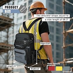 - 1.Tool backpack is made of 600D fabric and features a water-resistant compartment, providing protection for your tools during daily use. Scratch-resistant base reduces wear and tear, extending the backpack's lifespan 2.Tool backpack size: 11"L x 5.5"W x 13.6"H. Compact design for easy transport to worksites, featuring 30 storage pockets for both personal items and tools, ensuring each item has its place and offering you ample storage space 3.MELOTOUGH tool backpack offers 4 carrying options: detachable handle, top hooks for easy hanging, convertible single-shoulder/double-shoulder carry (with adjustable, detachable shoulder strap)—choose the way that works best for you. It is ideal for electricians, technicians, maintenance workers, plumbers, HVAC technicians, handymen, construction workers, carpenters, DIY enthusiasts, contractors, and more