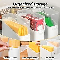 3-Pack Fridge Storage Bins: Includes three compact containers designed for organizing sliced food, snack bars, or small items inside refrigerators. The upright open-top structure makes it simple to view and retrieve contents, helping streamline shelf space while keeping items neat and separated. Stackable and Space-Saving Design: These bins can be arranged side-by-side or stacked when not in use. Ideal for maximizing fridge interior space, especially on narrow shelves or door trays. The shape supports vertical storage, preventing flat items from sliding or bending. Multi-Use Across Fridge Zones: Suitable for condiments, cheese slices, seasoning packets, chilled snacks, or sandwich ingredients. Helps separate items by category or frequency of use, supporting quick access during meal prep or storage rotation in cold environments. Clear and Uniform for Visual Order: Each bin offers a semi-transparent finish for quick identification of contents while keeping the fridge organized. Ideal for sorting by type or user, these bins blend naturally into kitchen or workplace cold storage setups. Compact Footprint with Upright Layout: Designed for standard refrigerator shelves, these bins take up minimal horizontal space while providing stable vertical storage. Their rectangular profile makes them easy to reposition as storage needs shift, from daily lunches to weekend gatherings.