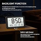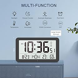 【10-inch LCD Multi-Functional Display】 JoFomp large digital clock with seconds features a 10-inch LCD screen; time (with seconds), date, week (display in 7 languages: ENG, GER, ITA, FRE, DUT, SPA, DAN), temp, and humidity are clearly visible and can be easily read from a distance. The digital alarm clocks for bedrooms supports 12/24H format switching and includes dual alarm + snooze function, battery alarm clock can better plan your itinerary. With a one-touch DST adjustment, not only practical but also considerate. 【Backlight + Auto Dimming】 This digital wall clock large display is equipped with a soft backlight feature, allowing you to easily read the time at night without disturbing your sleep. The top of the large number digital clock includes “Backlight” button. Lightly touch it to turn on the backlight, which stays on for 5s each time. Meanwhile, the back of the wall mount digital clock also includes an “AUTO LIGHT” button, which turns the auto dimming function on/off. When auto dimming is turned on, the digital desk clock will emit a faint glow at night. If you still cannot see the time clearly with auto dimming, you can lightly touch the “Backlight” button to help you see the time. 【Dual Power Options】 This large digital wall clock battery operated can be powered by 3 * 1.5V AAA alkaline batteries (not included) or an external USB power supply (USB cable included), allowing you to use the battery operated digital wall clock anywhere, even without an external power source. 【Different Usage Methods】 The back of the table clocks for living room has a retractable desktop stand and two hanging holes. You can hang the desk clock digital on the wall or place it on a desktop according to your personal preferences to meet different needs. 【The Perfect Gift】 With its sleek, modern design, the JoFomp LCD backlight wall digital clock battery operated fits seamlessly into any setting. Whether for a housewarming, birthday, or holiday, the bedside clock is a thoughtful and practical gift choice that anyone will appreciate.