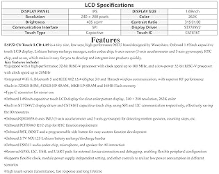 - Description ESP32-C6-Touch-LCD-1.69 is a tiny size, low-cost, high-performance MCU board. Onboard 1.69inch 262K Touch LCD display, Lithium batt-ery recharge manager, audio codec chip, 6-axis sensor (3-axis accelerometer and 3-axis gyroscope), RTC chip, and so on, which makes it easy for you to develop and integrate into products quickly. ESP32-S3 suitable for AIoT applications: Equipped with a high-performance 32-bit RISC-V processor and a low-power 32-bit RISC-V processor, the main frequency is up to 160 MHz, Powerful AI Computing Capability & Reliable security features. Features Integrated WiFi 6, Bluetooth 5 and IEEE 802.15.4 (Zigbee 3.0 and Thread) wireless communication, with superior RF performance. Built-in 320KB ROM, 512KB HP SRAM, 16KB LP SRAM and 16MB Flash memory. Type-C connector for easier use. Onboard 1.69inch Touch LCD display for clear color picture display, 240 × 280 resolution, 262K color. Built-in ST7789V2 driver chip, using SPI communication, effectively saving the IO resources. Onboard QMI8658 6-axis IMU (3-axis accelerometer and 3-axis gyroscope) for detecting motion gestures, counting steps, etc. Onboard PCF85063 RTC chip for RTC function requirement. Onboard RST, BOOT and a programmable side button for easy custom function development. Onboard 3.7V MX1.25 Lithium batt-ery recharge/discharge header. Reserved GPIO, I2C, USB, and UART pads for external device connection and debugging, enabling flexible peripheral configuration. Supports flexible clock, module power supply independent setting, and other controls to realize low power consumption in different scenarios. Support AI voice interaction: Allows access to online large model platforms such as DeepSeek, Doubao, ChatGPT,etc. Onboard ES8311 audio codec chip, microphone, and speaker for AI interaction. Comes with Online Tutorial Usage Guide and Online Development Resource, Please check: n9.cl/dubgl Package Content ESP32-C6-Touch-LCD-1.69 x 1 6Ω 1W speaker × 1