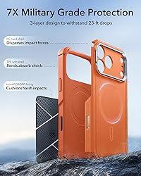 Compatibility: only for iPhone 17 Pro Max; full functionality maintained via precise speaker and port cutouts and easy-press buttons Camera Control: fully compatible with iPhone's Camera Control, allowing precise and quick photo adjustments through clicks, presses, or swipes for a seamless experience Military-Grade Protection: rigorously tested to ensure 7x total protection on all sides, 3-layer structure with a hard TPE and PC outer shell resists impacts and scratches, while the soft inner shell absorbs shocks, protecting against drops up to 23 ft Built-in Camera Stash Stand: stand tested for 3,000+ uses, protects the camera, and supports 0-85° viewing angles in both portrait and landscape, ensuring stability and durability Stronger Magnetic Lock: powerful ring of magnets with 1,500 g of holding force enables faster, easier place-and-go wireless charging and a secure lock on any MagSafe accessory Complete Customer Support: detailed setup videos and FAQs, comprehensive 12-month protection plan, lifetime support, and personalized help