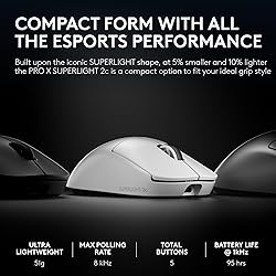 Designed With Pros, Engineered to Win: Designed alongside the world’s best esports athletes, the Logitech G PRO X SUPERLIGHT 2c compact wireless gaming mouse helps you perform at your peak and unlocks your potential The Icon, Now Compact: This super light and portable mouse features a compact design and programmable side thumb buttons, delivering comfort and precision for users with smaller hands or those who prefer a tailored grip style Precision from Within: The HERO 2 sensor in this PC gaming mouse delivers unmatched performance, tracking at over 888 IPS, 88 G-force, and up to 44,000 DPI—ensuring the precision champions rely on every play Undisturbed Gaming, Wherever You Play: Our LIGHTSPEED wireless operates at up to 8 kHz polling for a responsive and reliable tournament-grade experience (1) Play Longer: Get up to 95 hours of battery life on a single charge on this rechargeable wireless mouse; quickly recharge using the included USB-A to USB-C cable, or experience non-stop play with POWERPLAY (2) Zero-Additive PTFE Mouse Feet: Command a smooth glide and seamless connection to your game with zero-additive PTFE mouse feet on this lightweight gaming mouse (1) Advanced features require Logitech G HUB Software; tested on G640 mousepad (2) Battery life may vary based on user and computing conditions when in constant motion Note: PRO Series statistics based on 2024 data from prosettings.net