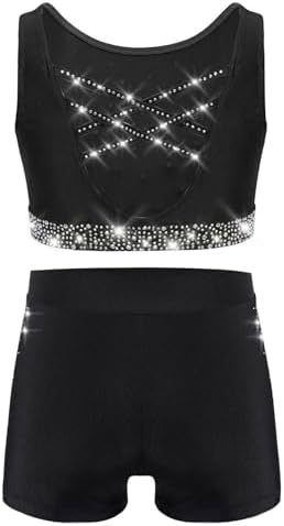 TiaoBug Kids Girls 2Pcs Shiny Rhinestones Sports Set Crop Top Shorts Set for Sports Yoga Gymnastics Dance