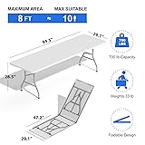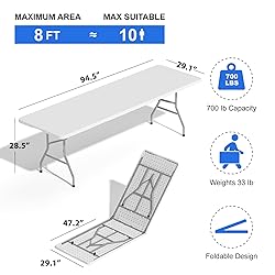 Heavy Duty Support: This folding table 8ft is equipped with premium steel legs, which is strong enough to hold weight up to 700lb. Besides, the folding table with non-slip rubber foot pads offer added sturdiness and protect the floor from being scratched Spacious Tabletop: Coming with a top measuring 94.5” x 29.1”, this 8 foot folding table is large enough to accommodate 8-10 people. And this plastic folding table can hold a large amount of food, drink, etc., to provide you with a orderly environment Portable & Folding Design: The security lock allows this white folding table to be tightly locked and easily stored in small spaces such as the bottom of the cabinet, car trunk and other spaces. The foldable table with carry handle makes transport conveniently Wide Application: White folding table is modern and stylish that can blend well with different places. You can use this foldable table for party, camping, BBQ and other events No Installation Required: You don't need to put extra effort into assembling this 8 ft folding table, just unfold it and you can get a perfect picnic table.The folding tables powder-coated surface is waterproof and can be cleaned and maintained easily