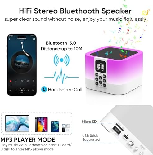 - 【6 in 1 Multifunctional Night Lights】Bluetooth 5.0 Hifi Speaker + White Noise Machine with Timer + Digital Alarm Clock + MP3 Player + Kids Night Light for Bedroom + Hands Free Call All in One! Supporting USB Flash Drive and Micro SD/TF Card input. Perfect for bedroom, living room, kitchen cooking, exercising, party, camping, or outdoor activities etc.