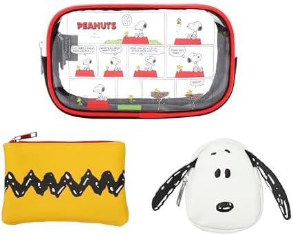 Add classic comic charm to your beauty essentials with this Peanuts cosmetic set. It includes a clear bag with red trim and Snoopy comic panels, a pouch styled like Charlie Brown's shirt, and a round pouch shaped like Snoopy's head. Each bag features a top zip closure, and the two smaller pouches nest neatly inside the largest one. Made with PU and PVC materials, this set ensures durable use. Wipe it clean for simple care.