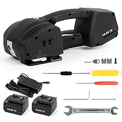 UNIQUE ADJUSTMENT DESIGN: It offers a manually adjustable tensile force that ranges from 400N to 3200N. This feature, along with the ability to adapt tension and fusion time, enables the machine to handle a variety of strapping needs such as paper, fabric, and building materials. EXTENDED BATTERY LIFE: The Electric strapping machine is powered by 2pcs 4000mAh batteries. When fully charged, each battery can operate approximately 300 belts. Regardless of whether the task is light or heavy-duty, this portable baler proves to be a reliable assistant. PARAMETERS: This automatic strapping tool is compatible with PP/PET straps ranging from 1/2 to 5/8inch in width and 0.4-1.2mm in thickness. It takes 90 minutes to fully charge the battery. HIGHER WORK EFFICIENCY: Compared with manual strapping machines, automatic strapping machines can save you a lot of time and labor. The device combines tensioning, cutter, and banding in one device, with no need for buckle or seals, while improving efficiency, reducing the waste of strapping roll, and saving steel resources. Also, without the need to connect wires, the portable electric baler can work anywhere, anytime when fully charged. ENHANCED STRUCTURE: This strapping machine features a brushless motor, showcasing an improved internal structure for higher strapping efficiency. The welding base and wear parts are crafted from durable titanium alloy, extending the tool's lifespan.