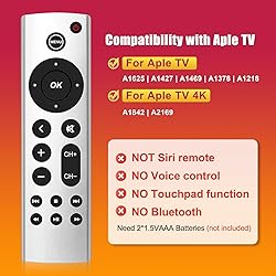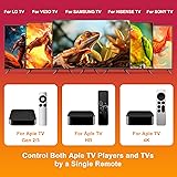 【Compatible Models】 New Universal Replacement Remote Fit for All Aple TV 4K HD, Fully functional compatible with Samsung, LG, Westinghouse, Insignia, Vizio, Toshiba TVs.for ALL APLE TV models - Aple TV 4K/ Gen 1 2 3 4/ HD A2843 A2737 A2169 A1842 A1625 A1427 A1469 A1378 A1218. 【Note】 This is an IR remote (not Bluetooth/RF) and requires line-of-sight to work. It has no Siri remote function, no voice control, and no touchpad. It is not compatible with HomePod Mini/HomePod (you'll need the original remote for these devices).The power/volume/mute buttons only work with Samsung, LG, Vizio, Hisense, Amazon Fire, Toshiba, and Insignia Fire TVs!To use this remote, please switch your TV's input/source to the TV channel first, or press the menu button to activate the TV. 【Nice Remote Control】Our remote has been upgraded to give you a greater transmitting distance (over25 ft) and has a quick response time of 0.3 seconds,and the keys have been tested to support over 120000 click. 【Premiun Materia】The remote Material Made of ABS Plastic and Silicone,so that makes remote very comfortable and durable,the keys are soft and respond very sensitively. 【Packing Included】NO more worry on pairing. Just need to insert 2*AAA remote and it's ready for use. (Batteries are NOT included)